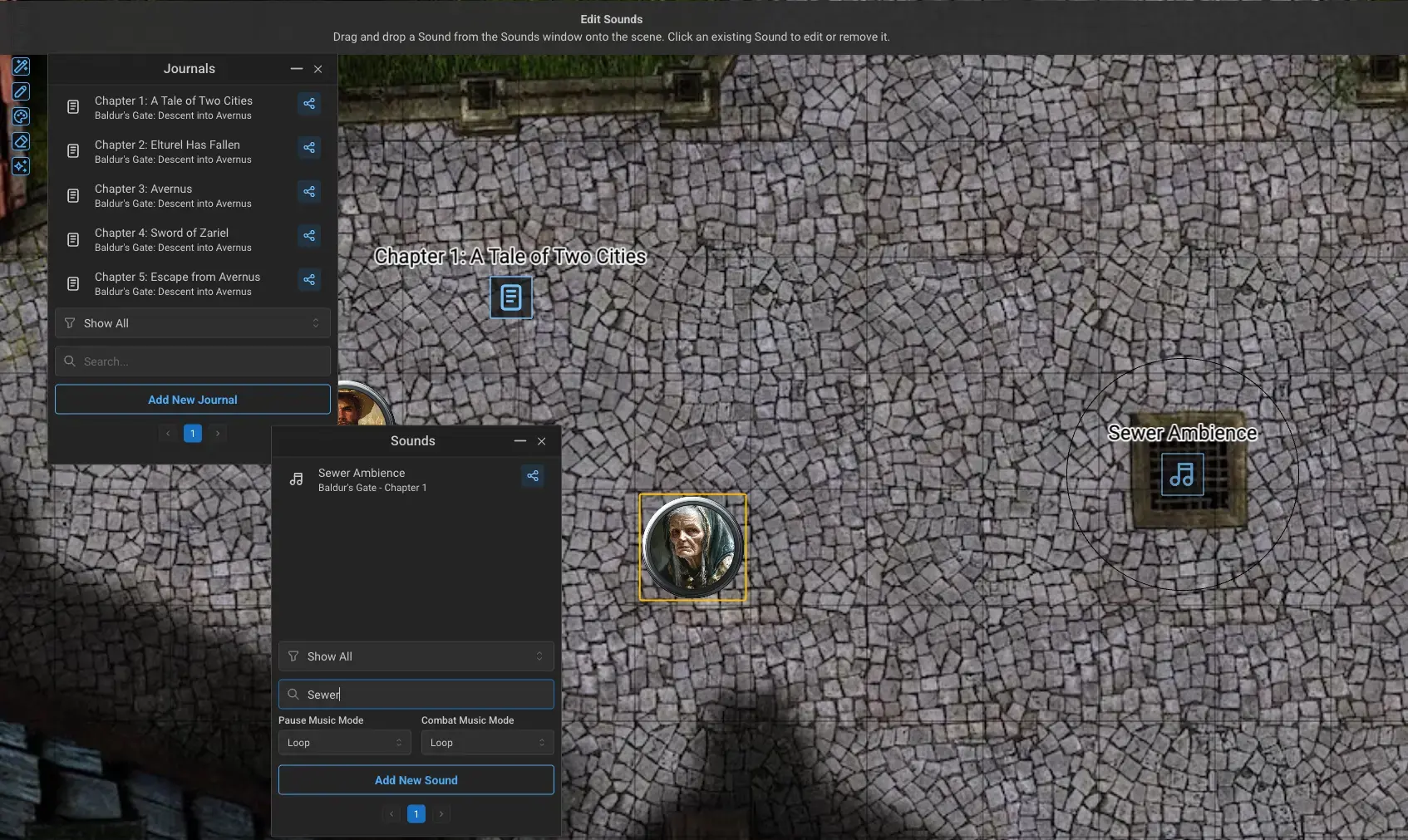 Dragging a sound file onto the scene places an ambient sound source at that location. The sound plays for tokens within a configurable fall-off radius, meaning players only hear it when their characters are nearby. Use this for crackling torches in a dungeon, tavern music, rushing water, or the ominous hum of a magical artifact. Positional audio adds a layer of immersion that flat background music cannot match.